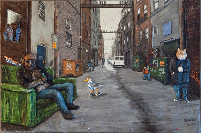 In one sense my caricatures are inspired by my observation that in our post-industrial society, with its widespread alienation and anomie, animals often bridge the gap between people. We often look past one unknown individual on the street, and yet we will stop to greet and pet the dog of another unknown person. Panhandlers know that owning and having a pet with you brings more change. It allows us to see the panhandler with less judgement and more compassion. We can look at a dog seated on a couch in the alley smoking crack, and not be as afraid or disgusted as we would seeing humans doing the same thing. My dream has been to fashion humanity into my caricatures, so as to foster these type of reactions. I am continuing my interpretations of our world and the people who live in it with the hope of brightening as many lives as possible.