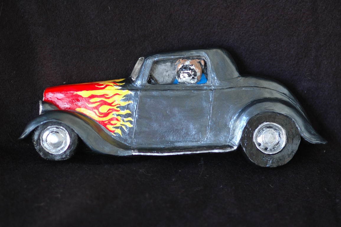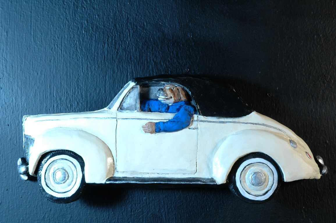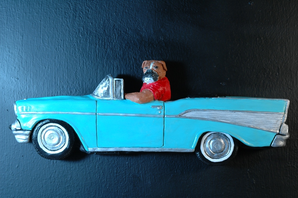 “Animal Town Classics” are wall hangings of cars with cats and dogs behind the wheel. These artist,s castings are based on accurate depictions of popular 50’s and 60’s cars with my caricatures behind the wheel. Front view cars are about 10″ wide and side views are about 10″ to 12″ long.